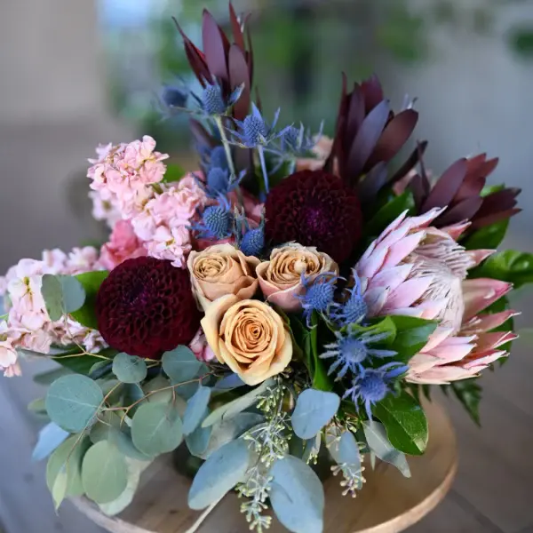 These arrangements contains a thoughtful assortment of beautiful blooms, complementary greenery and stunning accents. Our vases are hand-picked and selected with a keen eye for current style and composure.